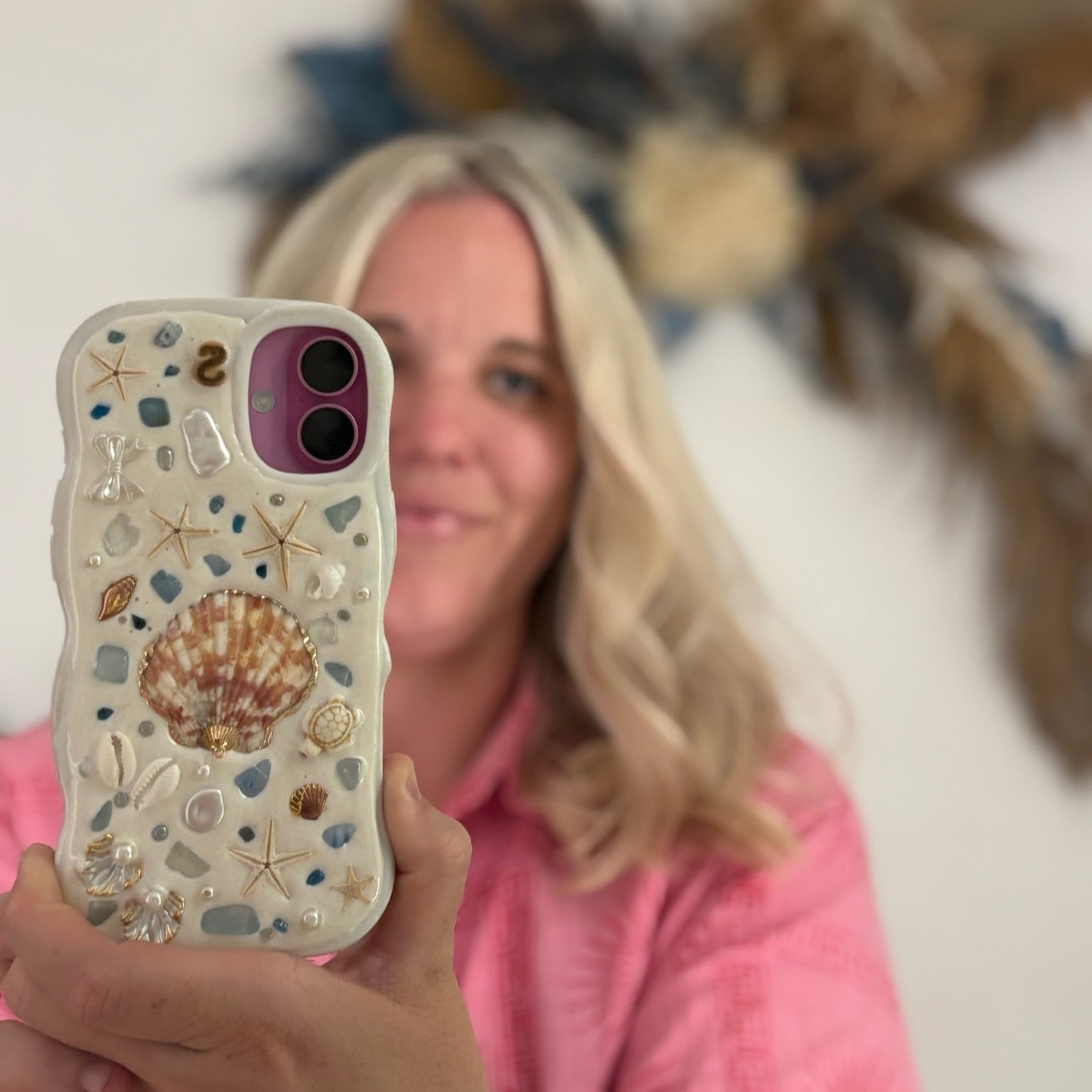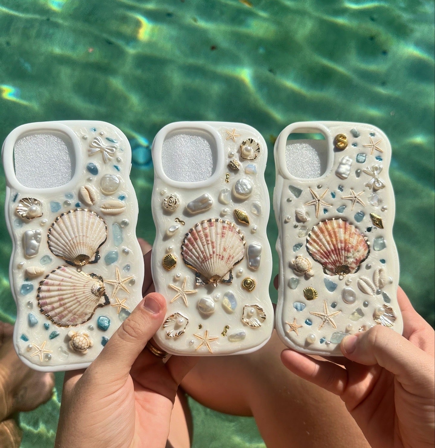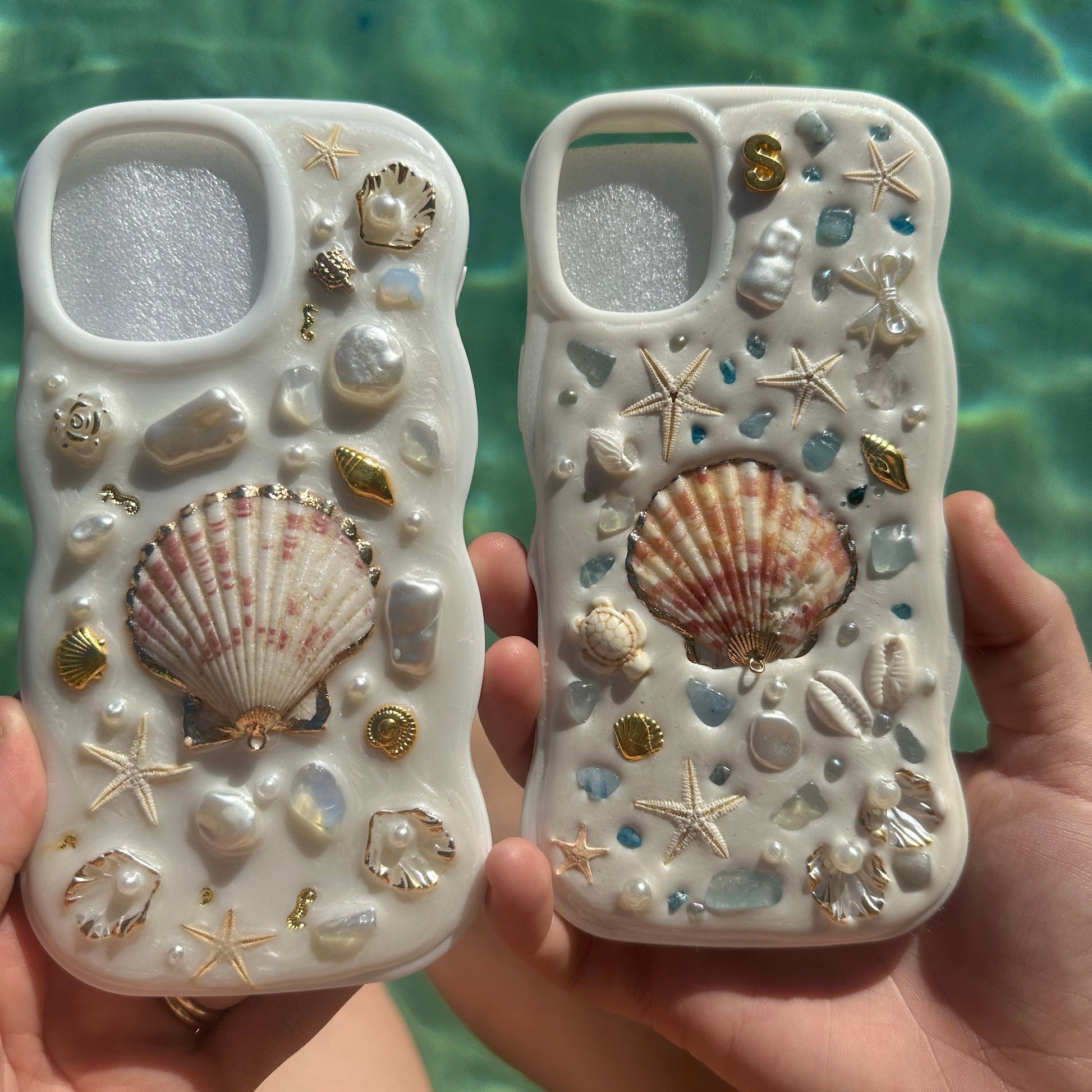 Set on a clean white base, this captivating case showcases a stunning large shell feature, glistening crystals, delicate charms, and shimmering accents. Each detail has been carefully curated to reflect the elegance and allure of the ocean, making it the ultimate statement piece.